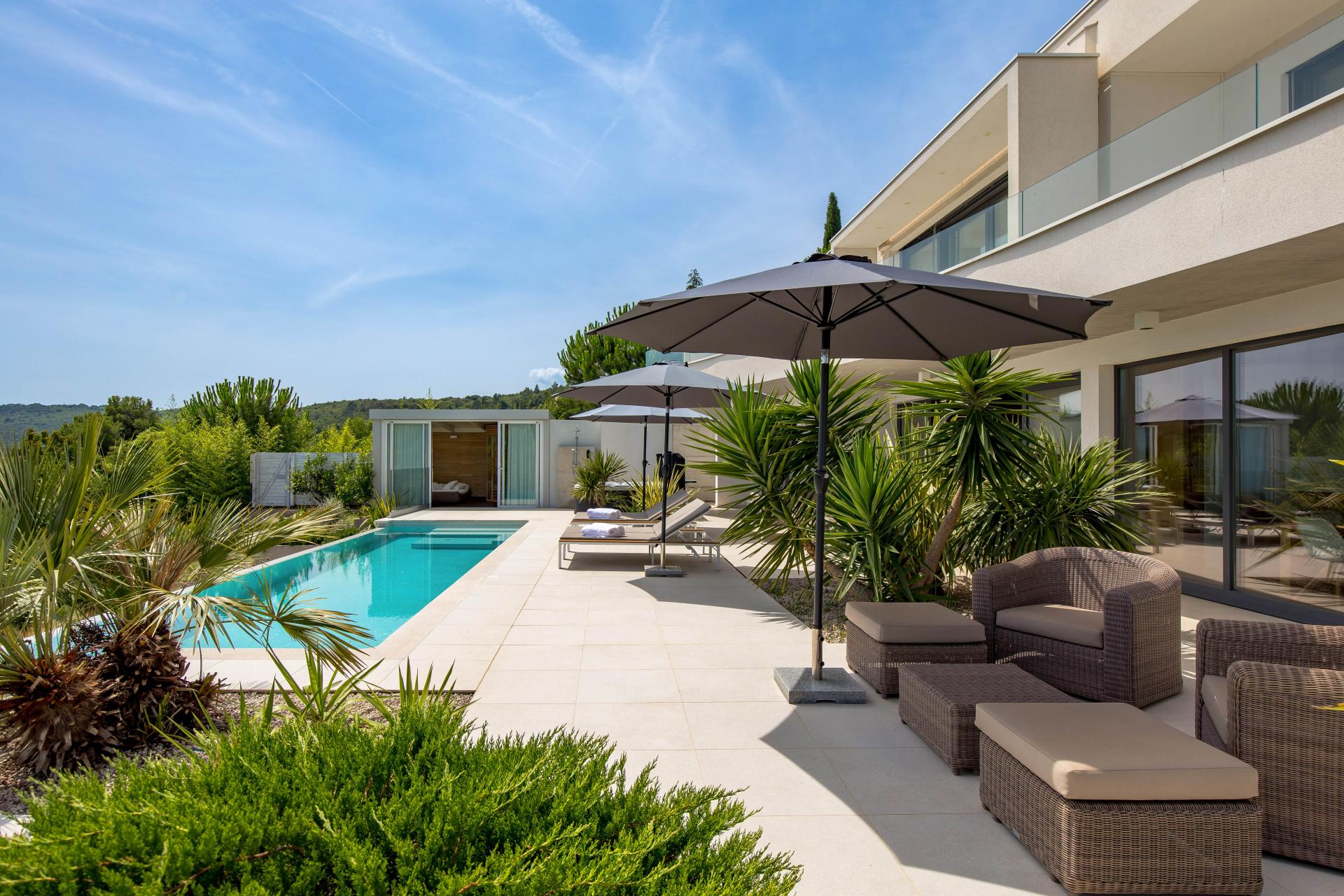 Stilvoll, modern und mit unglaublich viel Tageslicht, das durch das Open-Space-Konzept betont wird, bietet diese Schönheit einen luxuriösen und komfortablen Aufenthalt für Gäste. Der Innenraum wird von einer ovalen Treppe und einem großen Wohnzimmer mit klaren Linien und hellen Naturfarben, Holzböden und Glaswänden dominiert, die sich zu einer großen Terrasse mit Pool, Sonnendeck und Wellness öffnen.