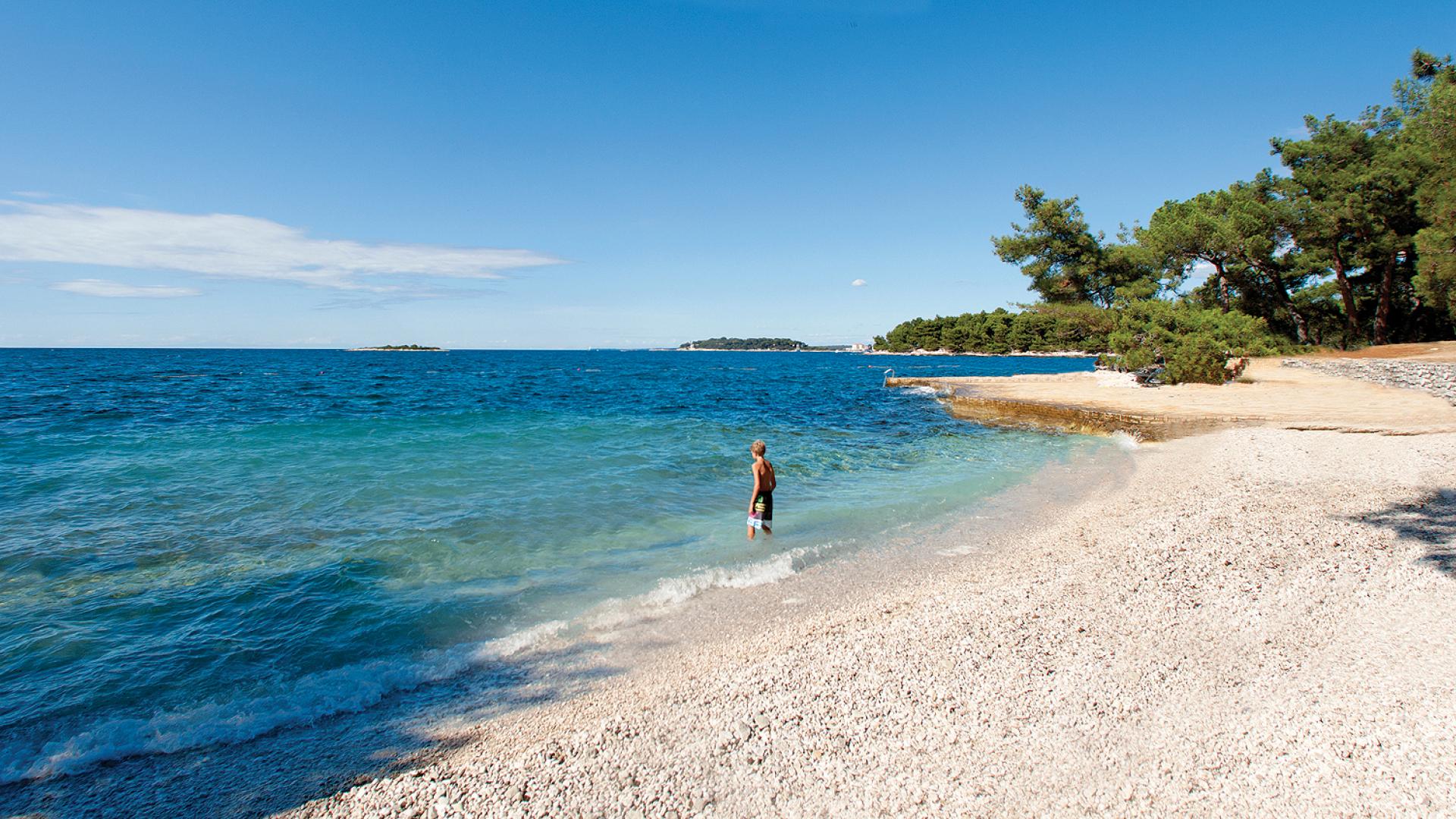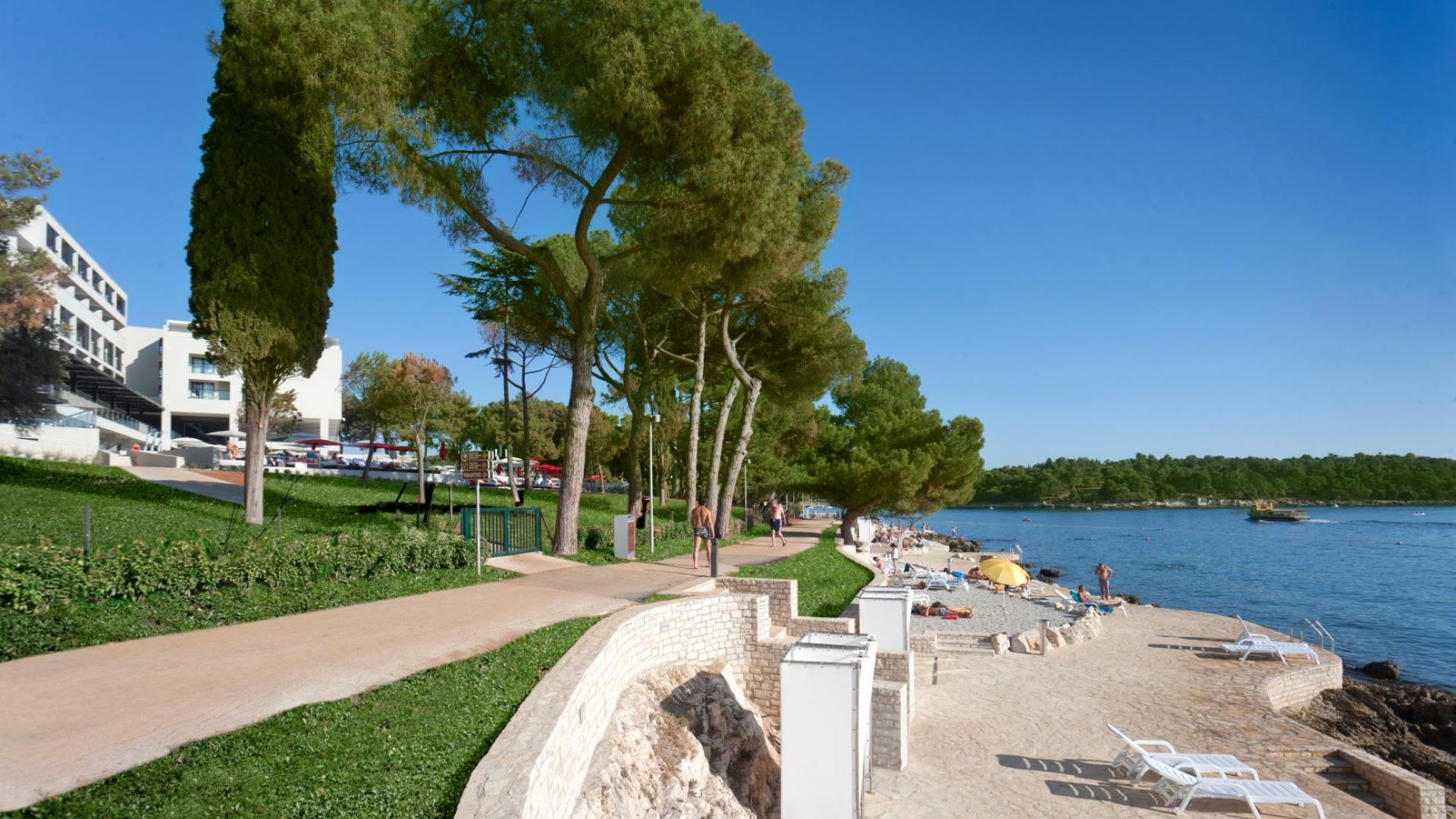 Hotel Parentium beach is a rocky resort beach, situated along a small peninsula and characterized by elevated reefs with smaller gravel sections. The beach has beach guards, lifesaving equipment, first aid, infirmary, facilities for receiving recyclable waste, catering establishment. The beach guards are present from 8 a.m. to 5 p.m. (May 15-September 30). There are no environmentally sensitive areas in close proximity of the beach and the beach can be approached by paved walkways. The beach has a bulletin board (info on conditions on the beach, results of sampling, map of sampling points, cultural and protected heritage, etc), camp reception disseminating all relevant information, eco-activities, signs, gazettes, regulations.
